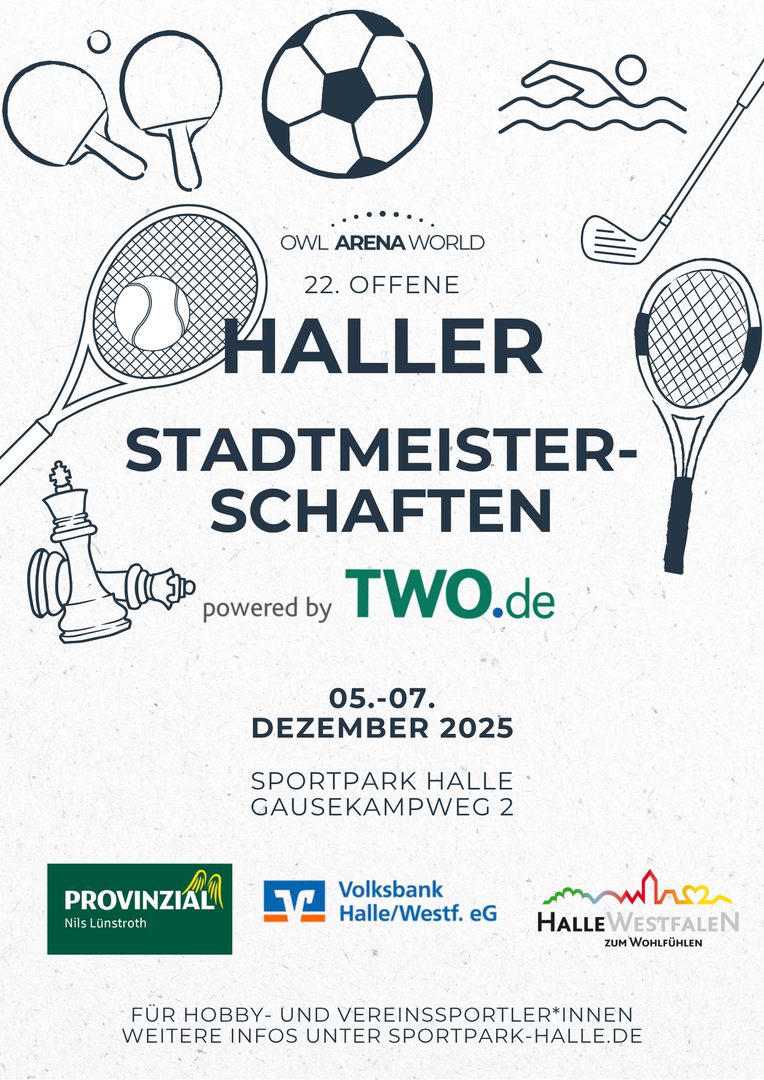 Auch in diesem Jahr finden die beliebten Haller Stadtmeisterschaften, für Hobby- und Freizeitsportler, wieder im Sportpark statt. In unterschiedlichen Disziplinen können sich Sportlerinnen und Sportler hier messen. Einmal mehr freuen wir uns über die Unterstützung unserer Partner Technische Werke Osning (TWO), die Volksbank Halle/Westf. sowie die Provinzial Versicherung Nils Lünstroth.