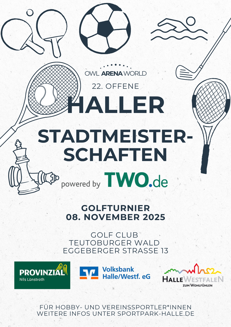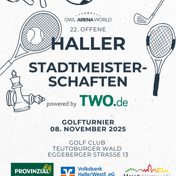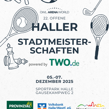 Für Hobby- und Freizeitsportler ist die größte regionale Breitensportveranstaltung „Halle bewegt sich“ powered by TWO.de aus dem sportlichen Terminkalender nicht mehr wegzudenken. Die „offene Haller Stadtmeisterschaft“ hat sich zu einer beliebten Breitensportveranstaltung im ostwestfälischen Raum etabliert. Dort können sich die Sportler in unterschiedlichen Disziplinen miteinander messen, unter anderem Tennis, Tischtennis, Squash, Badminton, Fußball, Golf, oder Schnell-Schach. Der Energieversorger Technische Werke Osning (TWO) sowie die Volksbank Halle/Westf. unterstützen das Event als wirtschaftliche Partner.